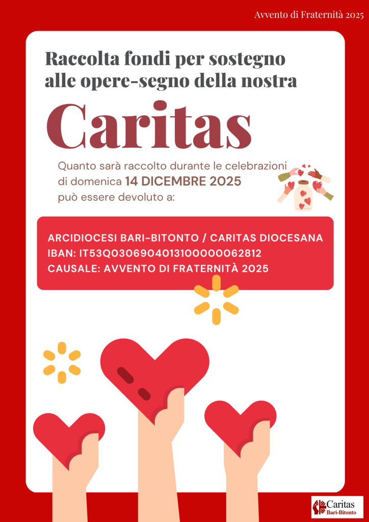 Raccolta Fondi per il sostegno alle opere-segno della nostra Caritas. Quanto raccolto durante le celebrazioni sarà destinato alle iniziative della Caritas Diocesana.