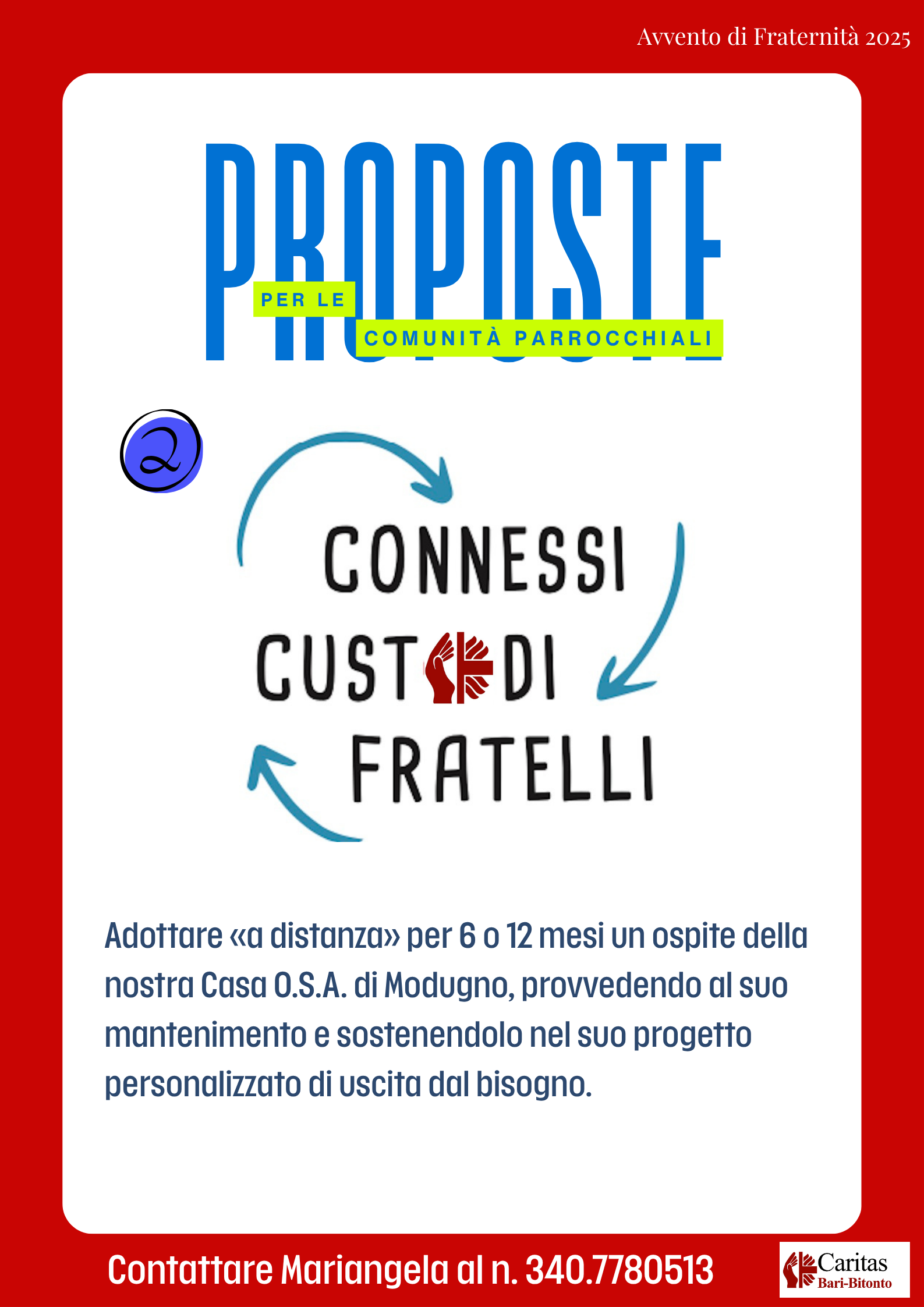 L’Avvento è tempo di attesa, ma soprattutto di fraternità concreta e di impegno verso chi è nel bisogno. Anche quest’anno, la Caritas Diocesana di Bari-Bitonto vi invita a vivere l’Avvento di Fraternità 2025 sostenendo le opere segno e le persone più vulnerabili del nostro territorio.
