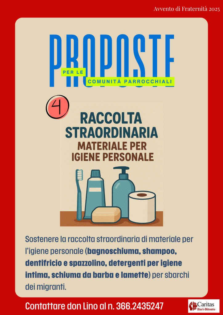 Sostenere la raccolta straordinaria di materiale per l’igiene personale (bagnoschiuma, shampoo, dentifricio e spazzolino, detergenti per igiene intima, schiuma da barba e lamette) per gli sbarchi dei migranti.