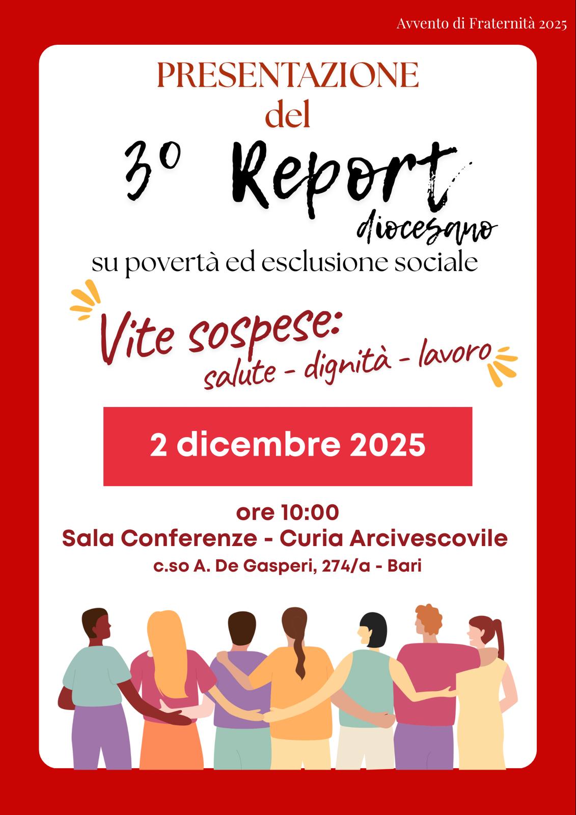 - 2 Dicembre 2025 – Ore 10:15 PRESENTAZIONE del 3° Report diocesano su povertà ed esclusione sociale dal tema: “Vite sospese: salute – dignità – lavoro”